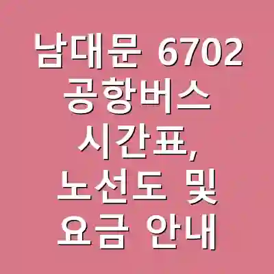 남대문 6702번 공항버스는 인천공항까지 편리하게 이동할 수 있는 직행 노선입니다. 시간표와 요금, 예매 방법을 정확히 파악하고 이용하면 원활한 공항 이동이 가능합니다. 안전하고 편리한 여행을 위해 미리 준비하는 것이 중요합니다.